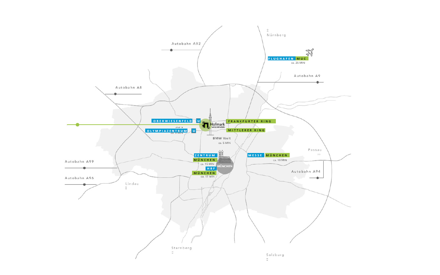Die Hofmark 4 liegt im Münchner Norden – nur wenige Minuten vom Frankfurter Ring und vom Mittleren Ring entfernt. Die U-Bahnstationen sind fußläufig erreichbar und auch das Stadtzentrum und der Flughafen sind gut angebunden.