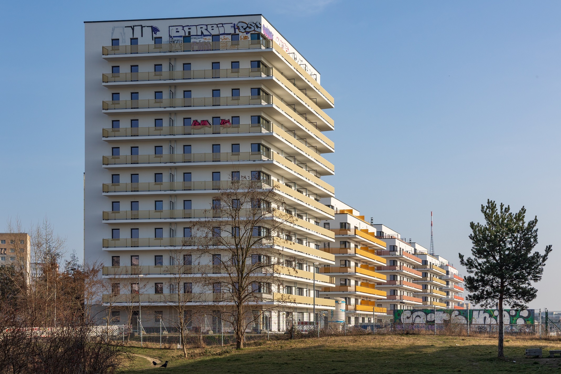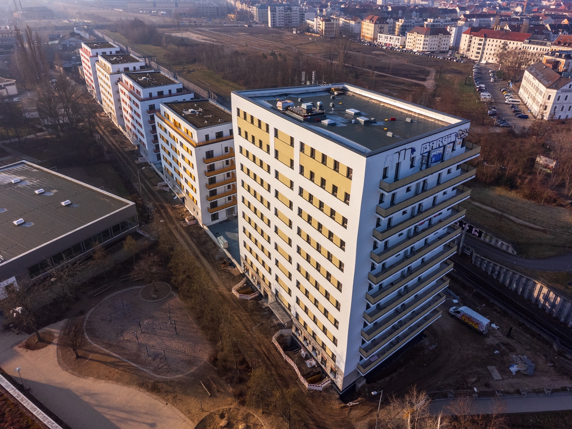 Vier siebengeschossige Gebäude und als markanten Akzent ein elfgeschossiges Hochhaus, welches den urbanen Charakter des Standorts widerspiegelt.