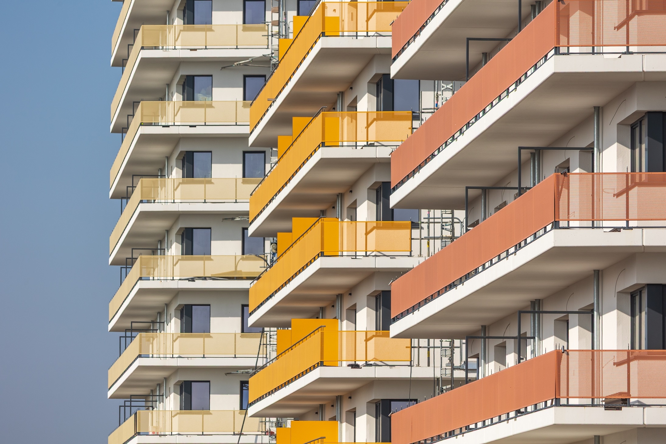 Die Geradlinigkeit der zeitlosen Architektur wird durch farblich gestaltete Balkone und Dachterrassen unterstrichen,