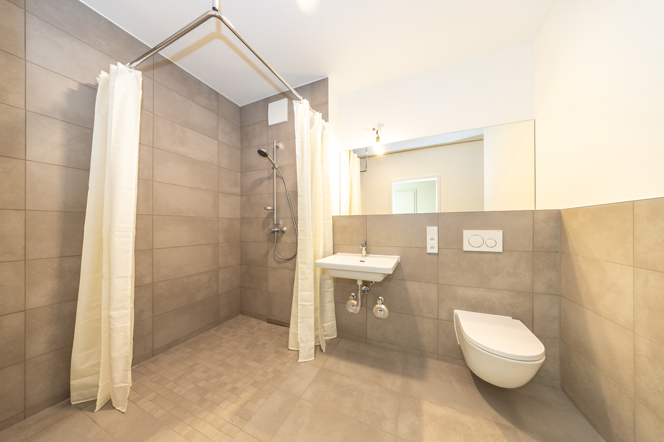 - Bäder mit Handtuchheizkörpern, großformatigen Fliesen und bodengleich gefliesten Duschen mit ESG-Glasabtrennungen