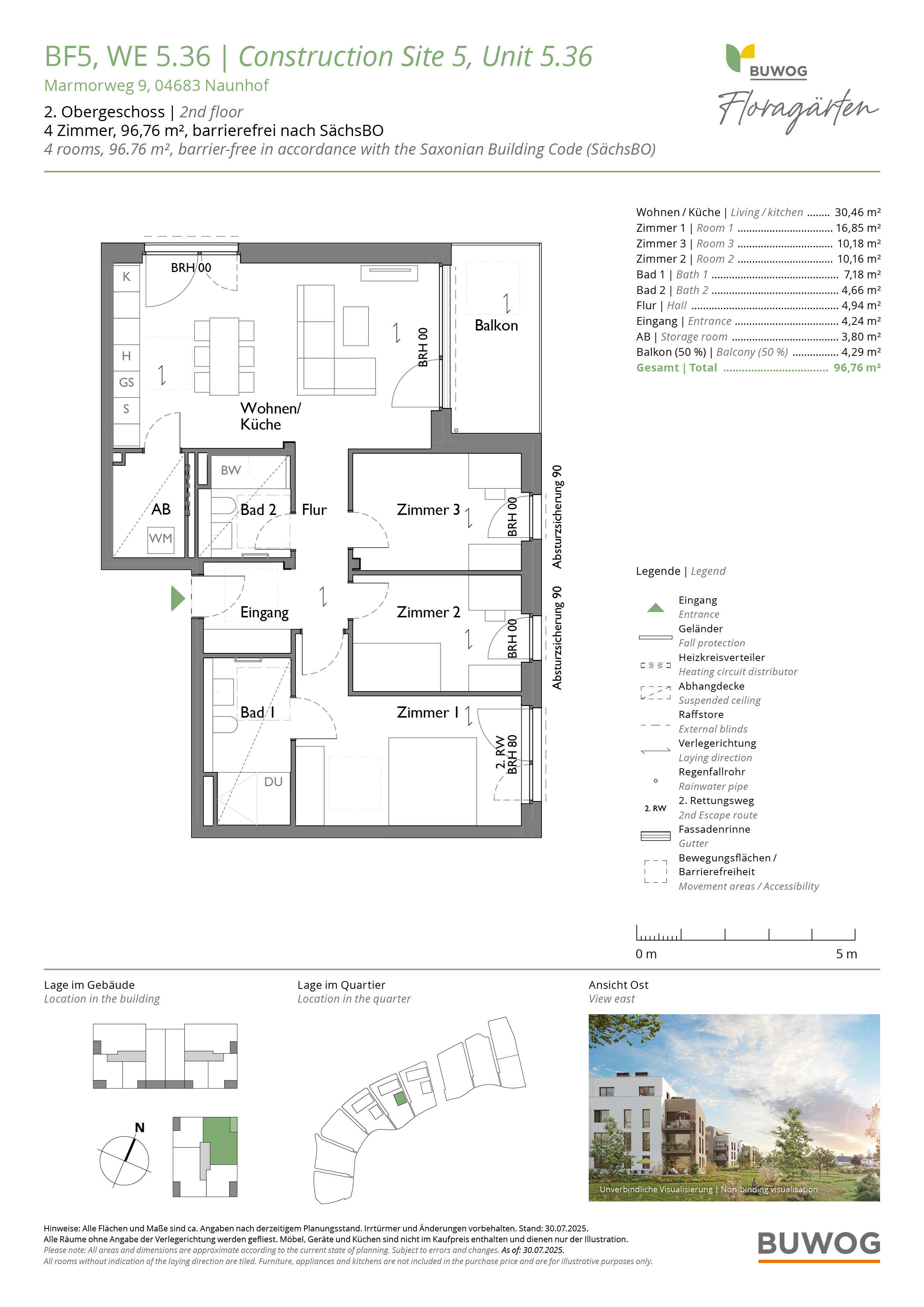 Direkt am Waldrand, in unmittelbarer Nähe zum Grillensee, baut die BUWOG hochwertige, teils barrierefreie Eigentumswohnungen mit 1 bis 5 Zimmer und vielseitigen Grundrissen. Die Wohnungen verteilen sich auf sechs locker angeordnete Gebäude, die in einer parkgleichen Außenanlage eingebettet werden – mit Wiesen, kleinen Wegen und vielen Bäumen, Blumen und Sträuchern. Die liebevoll begrünten Freiflächen bieten ganz viel Platz für Erholung und nachbarschaftliches Miteinander. Alle Wohnungen verfügen über Balkon oder Terrasse, Abstellkammer, Echtholzparkett und Fußbodenheizung. Die Energieversorgung setzt auf umweltfreundliche Photovoltaikanlagen und Luftwärmepumpen. (TH)