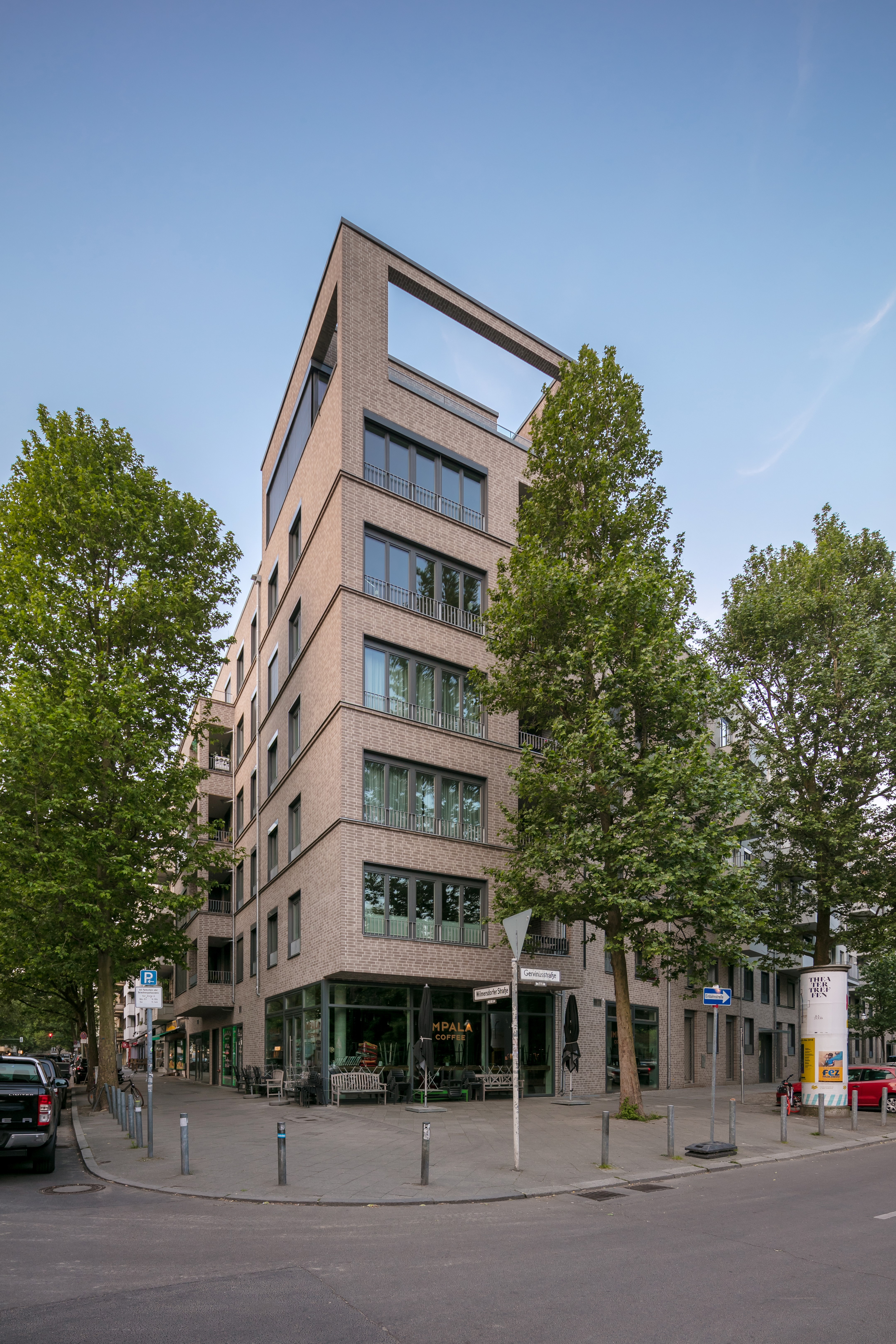 Die vielseitig gestaltete Fassade unterstützt die Adressbildung und integriert eine an der Eck angeordnete Gewerbeeinheit.