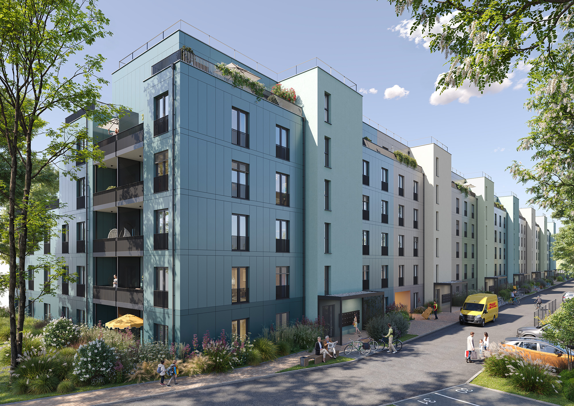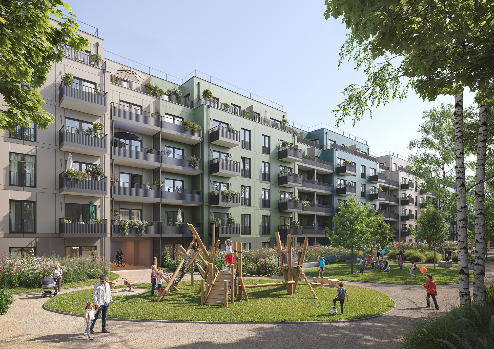 Die geplanten mehrgeschossigen Gebäude in Holzbauweise sind als Effizienzhaus 55 NH konzipiert und erfüllen die Kriterien des Qualitätssiegels Nachhaltige Gebäude. Sie entsprechen der Gebäudeklasse 5. Alle Dachflächen werden zudem extensiv begrünt sein.