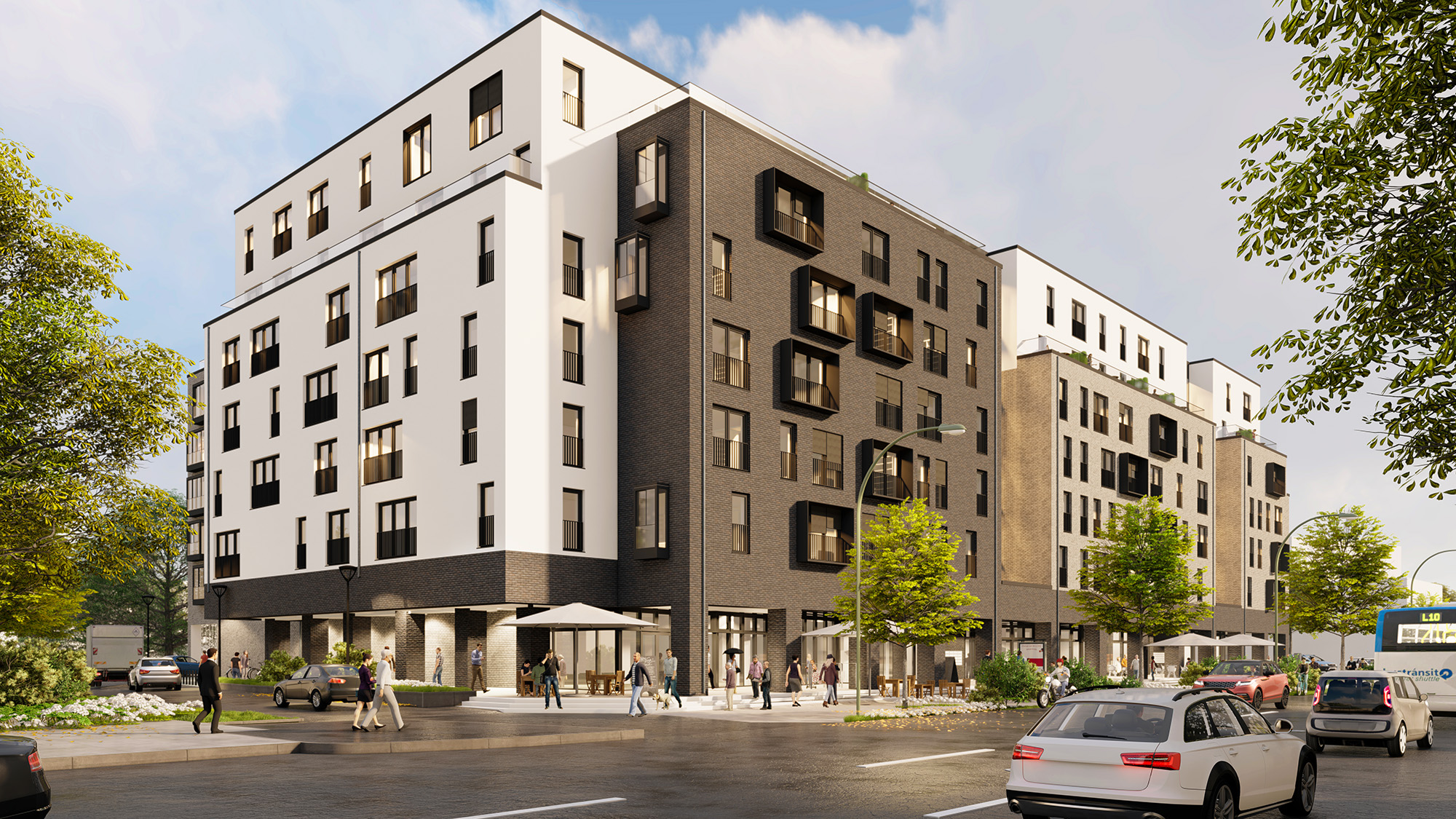 In bester Lage von Norderstedt realisiert die BUWOG ein Neubauprojekt mit Wohn- und Handelsflächen sowie einer Tiefgarage. Insgesamt entstehen 198 neue, teils öffentlich geförderte Mietwohnungen mit 2 bis 4 Zimmern, hochwertigem Komfort und hervorragender Anbindung an eine urbane Infrastruktur. In der Nachbarschaft befindet sich ein beliebtes Einkaufszentrum mit einer großen Auswahl an Gastronomie, Dienstleistern und Einzelhandel. Das Gebäudeensemble gruppiert sich um einen vielseitig begrünten Innenhof und entspricht dem KfW-55-Effizienzstandard mit zusätzlicher Nachhaltigkeitsklasse, die durch das Qualitätssiegel QNG zertifiziert wird. (TH)